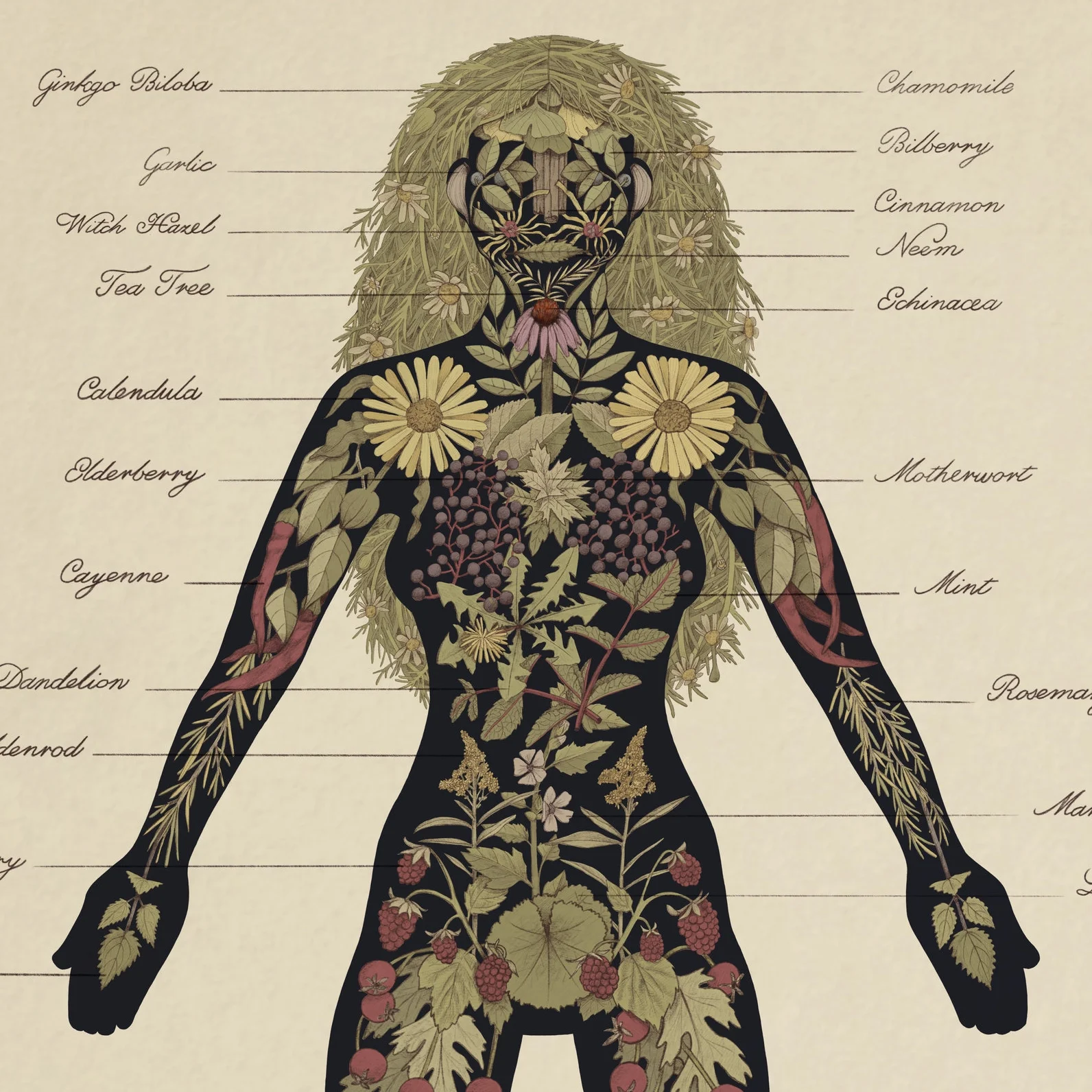 A chart of medicinal herbs inspired by the playfully unsettling work of Giuseppe Arcimboldo.
